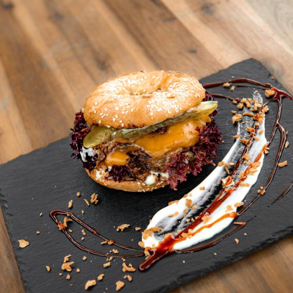 BBQ pulled pork, csemegeuborka, cheddar sajt, ranch szósz választható bagellel