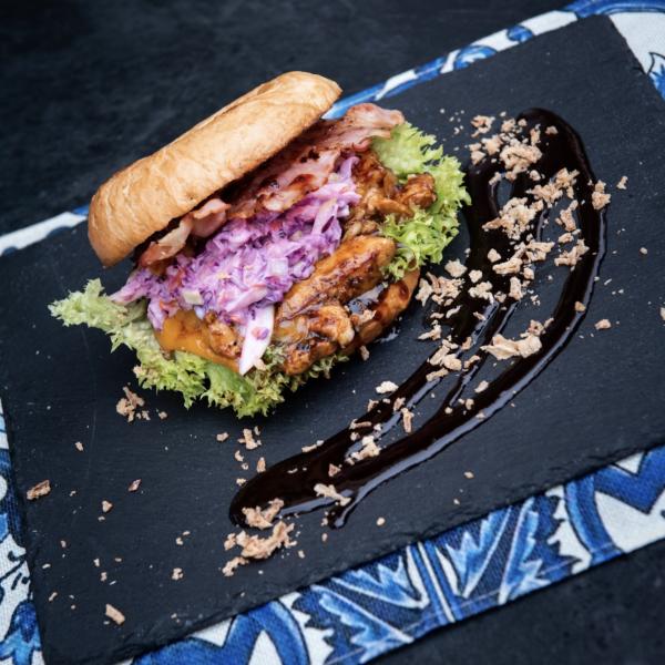 BBQ csirkemell, karamellizált bacon, lollo rosso saláta, pirított hagyma, almás coleslaw saláta, cheddar sajt, ranch szósz választható bagellel