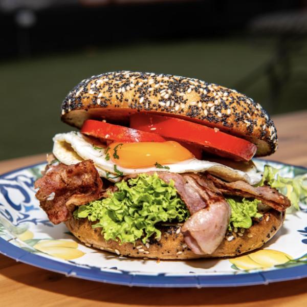 karamellizált bacon, lollo rosso saláta, paradicsom, pirított hagyma, tükörtojás, majonéz választható bagellel