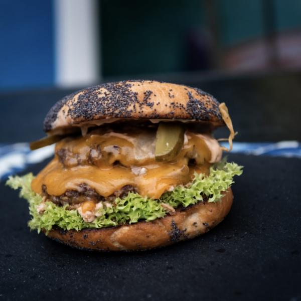 dupla marhahúspogácsa, bacon, cheddar sajt, házi hamburgerszósz választható bagellel