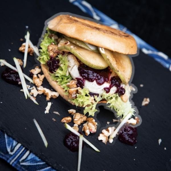 grillezett camembert sajt, lollo rosso saláta, méz, áfonyaöntet, görög joghurt választható bagellel, karanellizált zöld almával