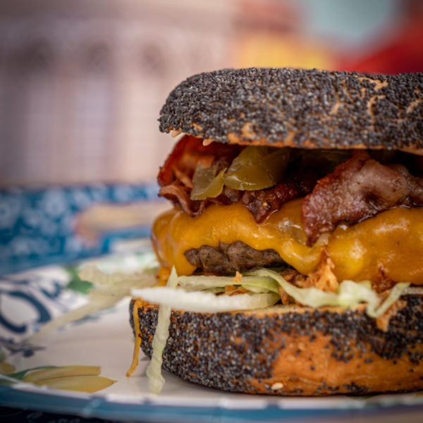 marhahúspogácsa, bacon, lollo rosso saláta, csemegeuborka, pirított hagyma, cheddar sajt, házi hamburgerszósz választható bagellel